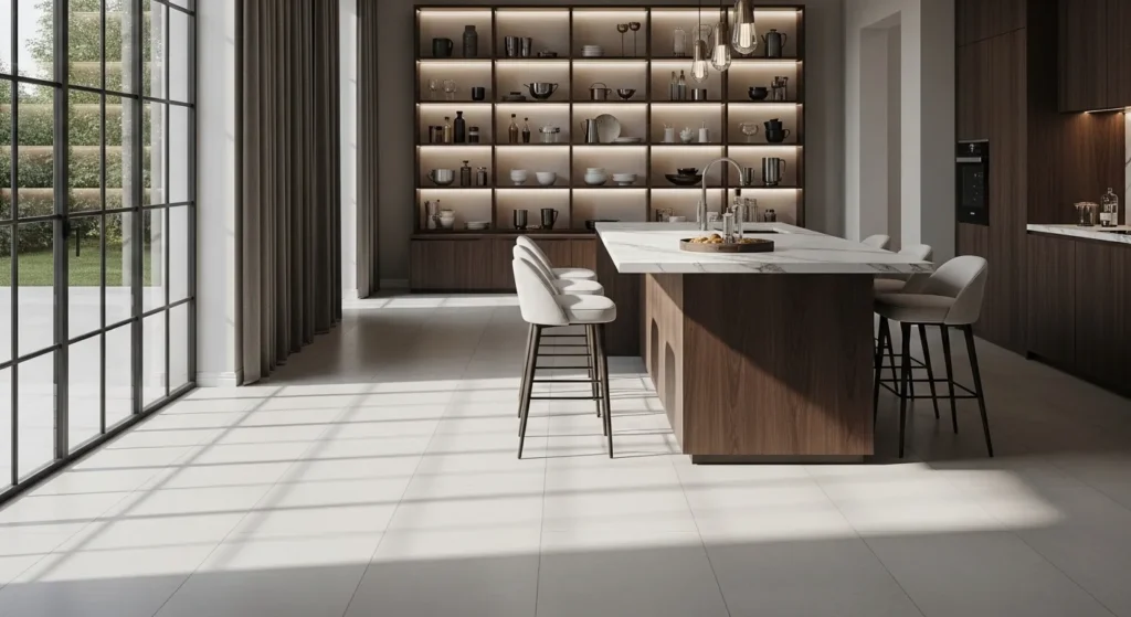 Além do tamanho, o porcelanato de grandes formatos tem baixa porosidade, alta resistência e acabamento sofisticado, o que permite ambientes com menos rejuntes visíveis e maior sensação de amplitude.